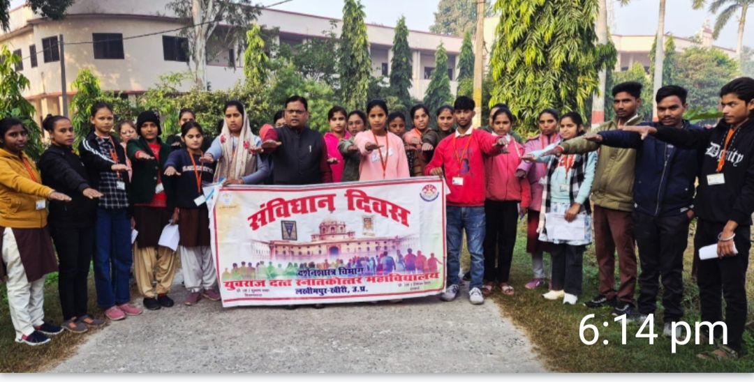 पलिया कलां (खीरी) युवराज दत्त स्नातकोत्तर महाविद्यालय, लखीमपुर-खीरी में संविधान दिवस 26 नवम्बर के अवसर पर प्राचार्य प्रो. हेमन्त पाल के दिशा-निर्देशन में दर्शनशास्त्र विभागाध्यक्ष प्रो. सुभाष चन्द्रा ने छात्र-छात्राओं को संविधान की प्रस्तावना का पाठ कराया तथा उन्हें संवैधानिक मूल्यों को सामाजिक एवं व्यक्तिगत जीवन में आत्मसात करने हेतु प्रेरित किया। उन्होंने छात्र/छात्राओं को बताया कि भारतीय संविधान भारत के राजनीतिक एवं सामाजिक जीवन का प्रतिनिधित्व करने वाला जीवन्त दस्तावेज है। युवा विद्यार्थी संविधान की मूल भावना को आत्मसात करते हुए आगे बढ़े तथा नागरिक दायित्व बोध के साथ राष्ट्र निर्माण में सहभागी बनें। इसी कम में युवराज दत्त महाविद्यालय तथा सेंटर फार द स्टडी आफ सोसाइटी एवं पॉलटिक्स (CSSP) कानपुर के संयुक्त तत्वावधान में एक राष्ट्रीय वेबिनार का आयोजन किया गया। वेबिनार का मुख्य विषय भारतीय संविधान की मूल भावना, उसके आदर्शों तथा 75 वर्षों की संवैधानिक यात्रा पर केन्द्रित रहा। राष्ट्रीय वेबिनार में मुख्य वक्ता के रूप में प्रो. विजय कुमार वर्मा, राजनीति विज्ञान विभाग, दयाल सिंह कालेज, नई दिल्ली व प्रो. सरोज कुमार वर्मा, पूर्व संकाय अध्यक्ष समाज विज्ञान संकाय, जय प्रकाश विश्वविद्यालय, छपरा ने सारस्वत वक्ता के रूप में सारगर्भित व्याख्यान दिया। वेबिनार में युवराज दत्त महाविद्यालय प्राचार्य प्रो. हेमन्त पाल तथा निदेशक सीएसएसपी कानपुर प्रो. ए.के. वर्मा, प्रो. जितेन्द्र नरायन, एल.एन. मिथिला विश्वविद्यालय, दरभंगा, डॉ. धर्मेन्द्र सिंह श्रीवास्तव, एकेडमिक निदेशक, सीएसएसपी, कानपुर व राजनीति विज्ञान विभागाध्यक्ष प्रो. संजय कुमार ने सारगर्भित व्याख्यान दिया।