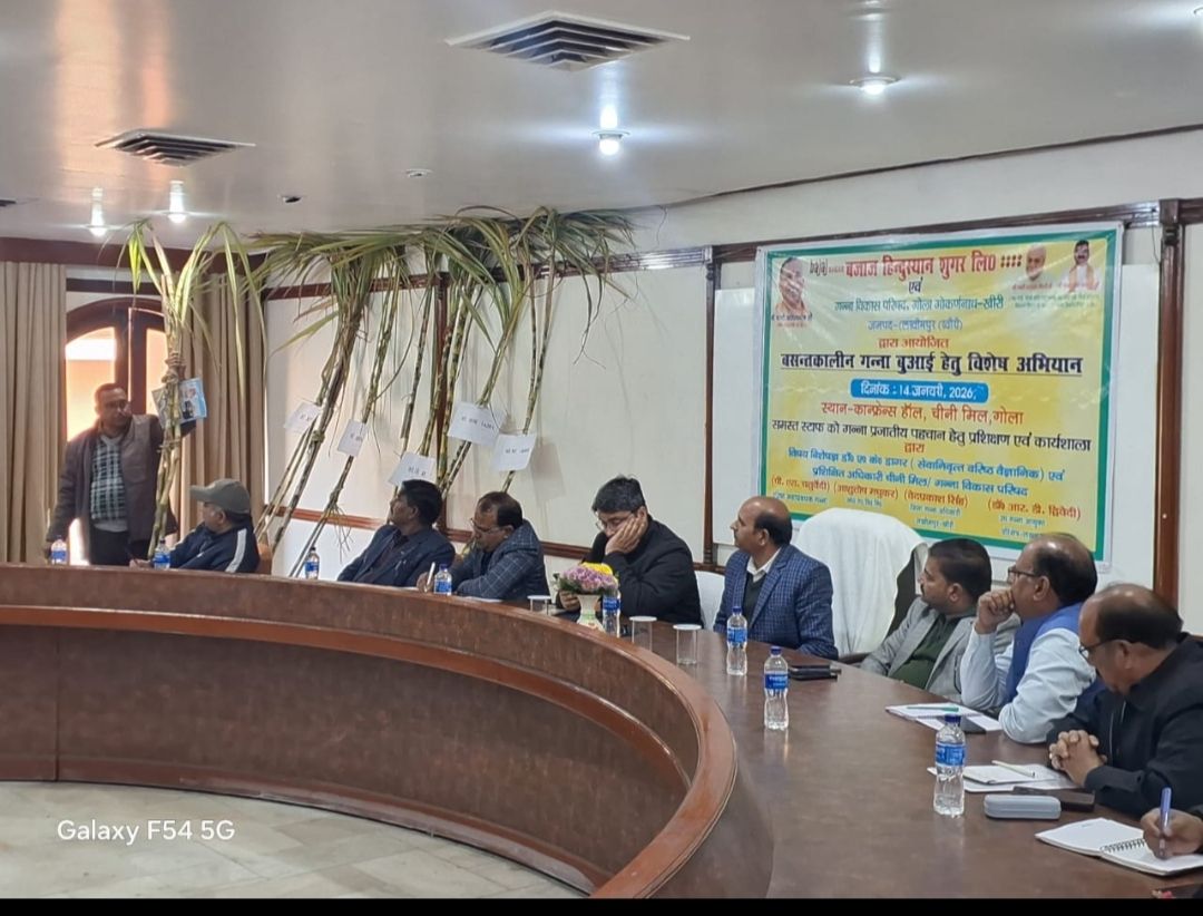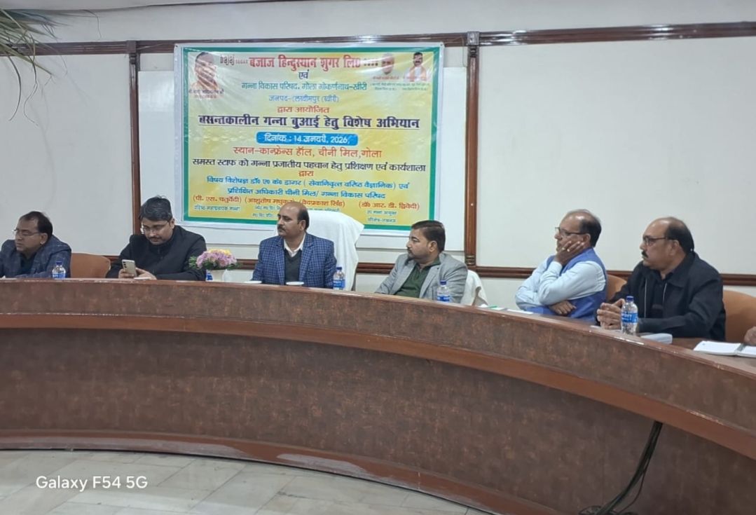 पलिया कलां (खीरी) गोला गोकर्णनाथ ( खीरी)बजाज हिन्दुस्थान शुगर लिमिटेड चीनी मिल गोला के सभागार में उप गन्ना आयुक्त डॉ आर डी द्विवेदी , जिला गन्ना अधिकारी लखीमपुर वेद प्रकाश सिंह एवं जिला गन्ना अधिकारी सीतापुर रत्नेश त्रिपाठी, यूनिट हेड राकेश यादव,वरिष्ठ महाप्रबन्धक गन्ना पी एस चतुर्वेदी,सहायक महा प्रबन्धक कारपोरेट असद शेख की उपस्थिति में सेवानिवृत्त वैज्ञानिक डॉ अवधेश कुमार डागर ने मिल व समिति के 75 गन्ना विकास कार्यकर्ताओ व प्रबंधकों को गन्ना प्रजातीय प्रशिक्षण दिया। इसी क्रम में 18 जनवरी को किसान के खेत पर जाकर प्रशिक्षण दिया जाएगा।