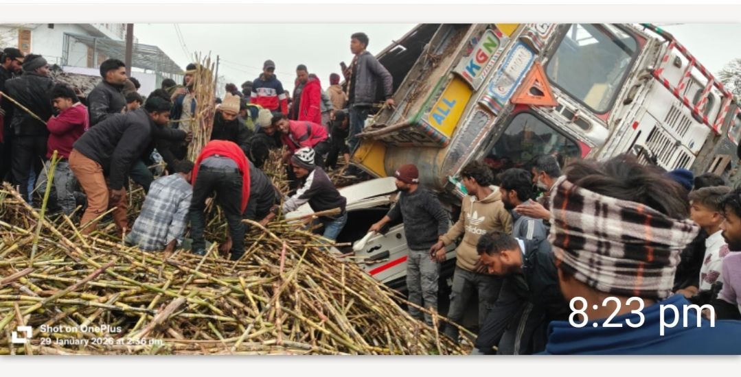 कस्बा में पुवायां मार्ग पर कुंभी चीनी मिल के एक सेंटर से ओवर हाइट गन्ना भरकर ले जाते समय ट्रक अनियंत्रित होकर पलटते समय बोलेरो चालक प्राइवेट स्कूल के बच्चों को ले लेकर घर छोड़ने जाते समय चपेट में आ गया जिससे सभी सवार बच्चे गन्ना के नीचे दब जाने से चीख पुकार मच गई जाति धर्म का बंधन छोड़ मानवता को लेकर सभी बचाने दौड़ पड़े पड़ोसी दुकानदारों ने कड़ी मशक्कत कर गाड़ी का शीशा तोड़कर सभी सवार 19 बच्चों को सकुशल बाहर निकाल लिया है। बच्चों के नीचे दबने की सूचना आग की तरह फैल गई हजारों की संख्या में लोग हाईवे पर एकत्र होकर बचाव कार्य में जुट गए जिसके चलते वाहनों की कई किलोमीटर लंबी कतारें लग जाने से आवागमन ठप हो गया समाजसेवी शिवम राठौर ने अपनी प्राइवेट जानकी एंबुलेंस से सभी बच्चों को अस्पताल लाया गया जहां से इलाज कर हालत ठीक होने पर छुट्टी दे दी जिन्हें परिजन लेकर अपने घर चले गए हैं ।घटना ने स्कूल प्रबंधन व्यवस्था और ओवर हाइट वाहनों के खिलाफ अभियान की पोल खोल दी है।