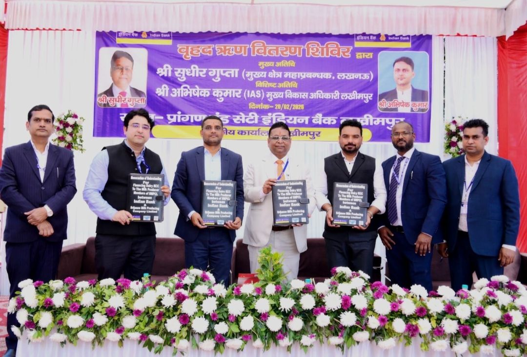 पलिया कलां (खीरी) लखीमपुर खीरी। इंडियन बैंक द्वारा जनपद खीरी के आर एस ई टी आई प्रांगण में ऋण शिविर आयोजित किया गया। सृजनी मिल्क प्रोडूसर कंपनी लिमिटेड के साथ एक महत्वपूर्ण समझौता ज्ञापन (एम ओ यू ) संपन्न किया गया। यह समझौता जनपद के दुग्ध उत्पादक सदस्यों को डिजिटल केसीसी (डेरी केसीसी ) ऋण उपलब्ध कराने के उद्देश्य से किया गया है, जिससे उन्हें सरल, त्वरित एवं पारदर्शी ऋण सुविधा प्राप्त हो सकेगी। इंडियन बैंक के अंचल प्रमुख अभय कुमार एवं सृजनी कंपनी के सीईओ लखविंदर सिंह के मध्य, मुख्य महाप्रबंधक सुधीर कुमार गुप्ता की उपस्थिति में संपन्न हुआ। इस अवसर पर इंडियन बैंक के उप अंचल प्रमुख अप्रतिम अवस्थी तथा लीड डिस्ट्रिक्ट मैनेजर एल डी एम अशोक कुमार गुप्ता उपस्थित रहे। कार्यक्रम को संबोधित करते हुए मुख्य महाप्रबंधक सुधीर कुमार गुप्ता ने कहा कि इस एम ओ यू के माध्यम से जनपद के दुग्ध उत्पादकों को इंडियन बैंक से डिजिटल डेयरी ऋण प्राप्त करना अत्यंत सरल होगा। इससे न केवल ऋण प्रक्रिया तेज होगी, बल्कि अधिकाधिक दुग्ध उत्पादकों को आर्थिक सशक्तिकरण का लाभ मिलेगा और वे आत्मनिर्भरता की दिशा में सशक्त कदम बढ़ाते हुए आत्मनिर्भर भारत के निर्माण में महत्वपूर्ण योगदान देंगे।