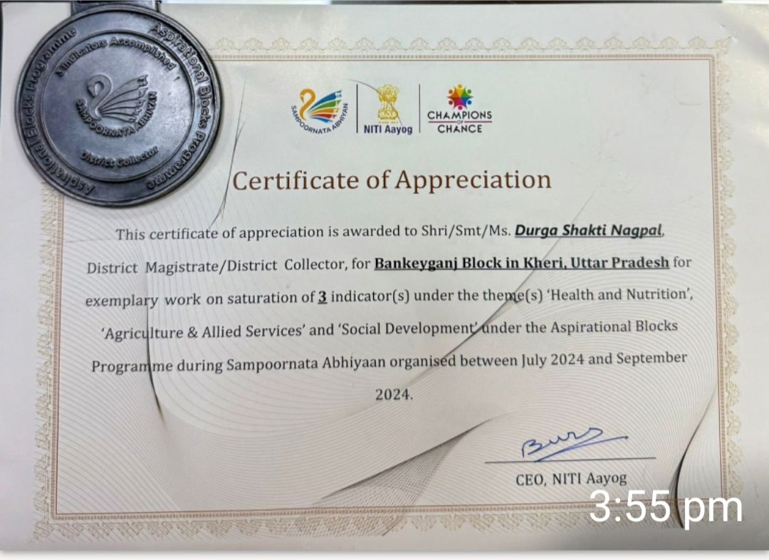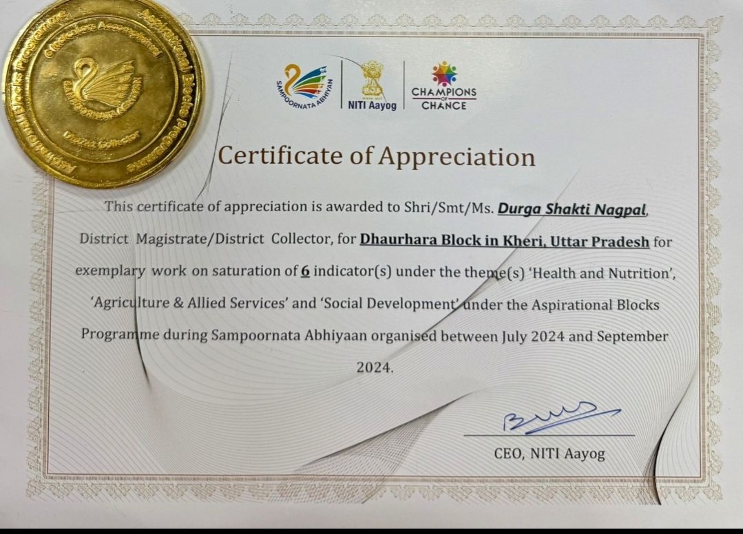 पलिया कलां (खीरी)लखीमपुर -खीरी 27 फरवरी। विकास की दौड़ में लखीमपुर खीरी ने ऐसा परचम लहराया कि राष्ट्रीय पटल पर उसकी गूंज सुनाई दी। जुलाई से सितंबर 2024 के बीच चले संपूर्णता अभियान में जिले के बांकेगंज और धौरहरा ब्लॉक ने प्रदर्शन की नई इबारत लिख दी। उत्कृष्ट कार्य के लिए नीति आयोग ने डीएम दुर्गा शक्ति नागपाल को सर्टिफिकेट ऑफ एप्रिसिएशन और मेडल प्रदान कर सम्मानित किया।