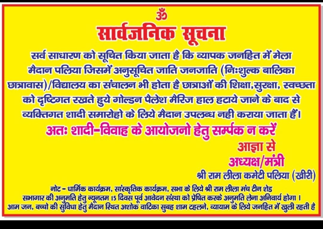 सर्व साधारण को सूचित किया जाता है कि व्यापक जनहित में मेला मैदान पलिया जिसमें अनुसूचित जाति जनजाति (निःशुल्क बालिका छात्रावास) / विद्यालय का संचालन भी होता है छात्राओं की शिक्षा, सुरक्षा, स्वच्छता को दृष्टिगत रखते हुये गोल्डन पैलेश मैरिज हाल हटाये जाने के बाद से व्यक्तिगत शादी समारोहों के लिये मैदान उपलब्ध नही कराया जाता हैं।